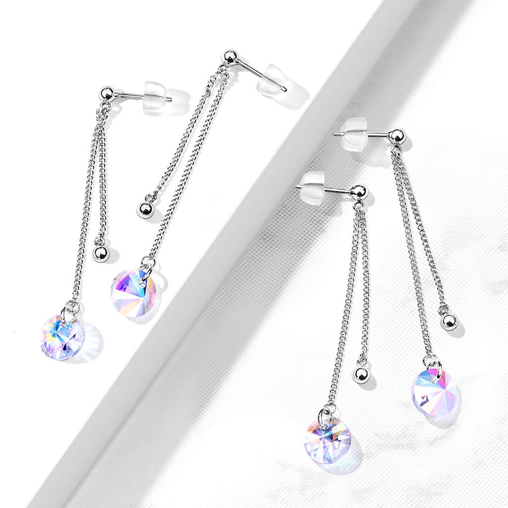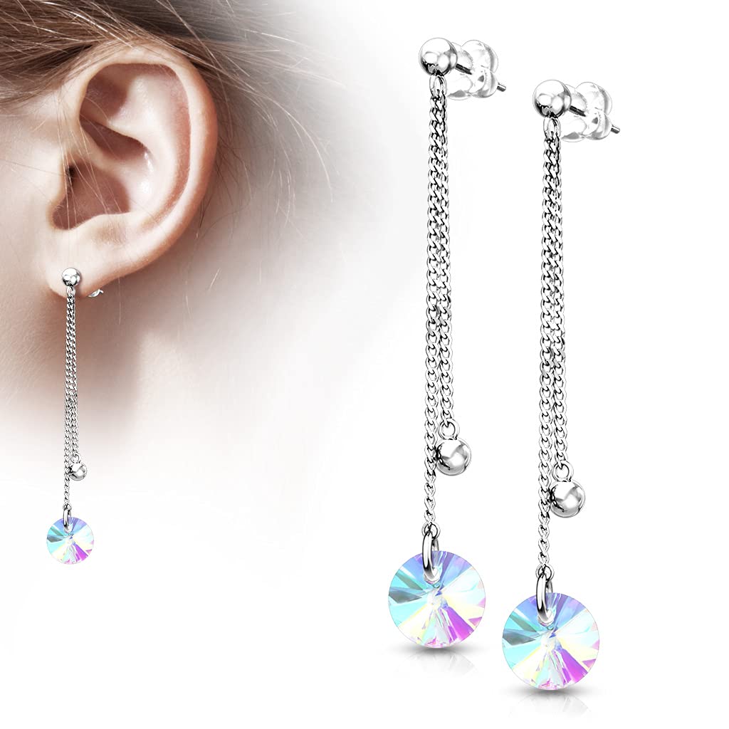 - Pair of 316L Surgical Steel Earrings with Double Chain and Multi-Faceted Iridescent Charm