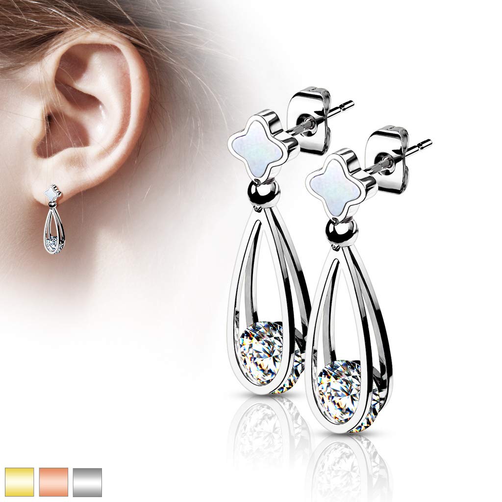- Pair of 316L Surgical Steel Shell-Filled Stud Earrings with Dangling Hollow Teardrop and Enclosed CZ