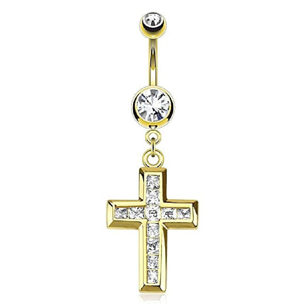 Bauchnabelpiercing GOLDENES Kreuz 14 Karat vergoldet Anhänger 1,6mm 10mm Nabelpiercing Chirurgenstahl Bananabell Zirkonia