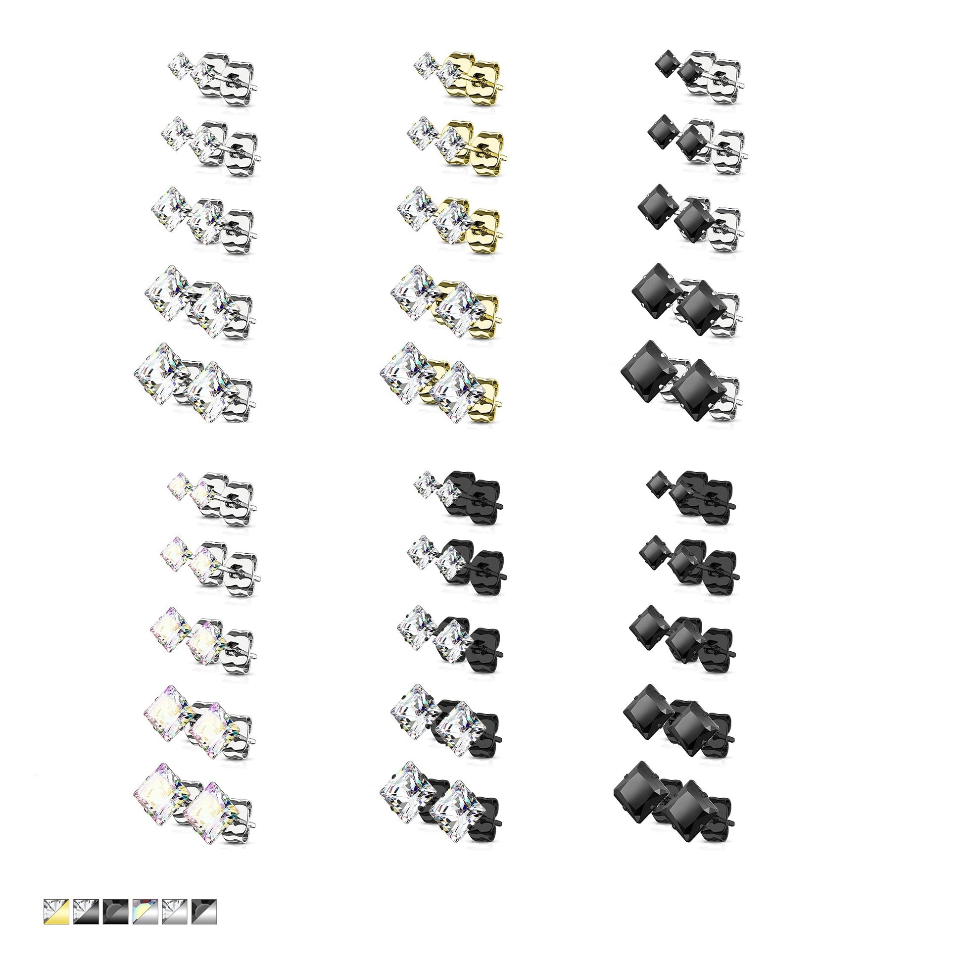- 5 Pairs of Assorted Sizes Prong Set Square CZ Stainless Steel Stud Earrings Pack